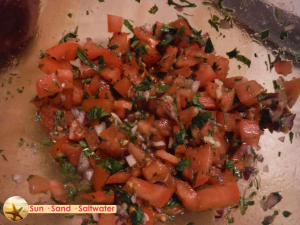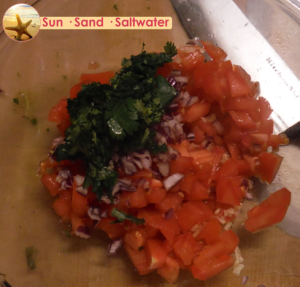 Dice the tomato, onion, garlic, and cilantro. Combine in a medium bowl.