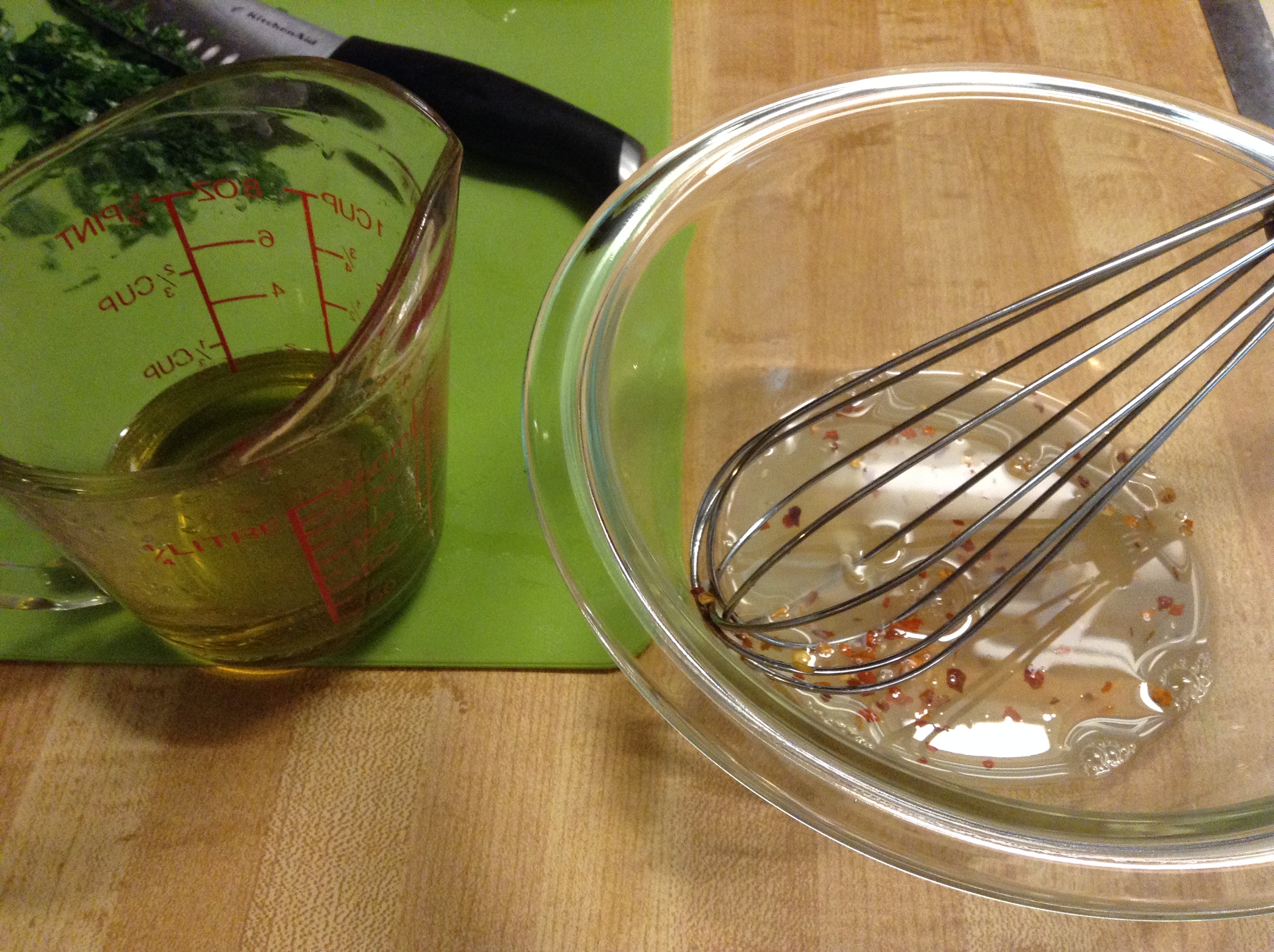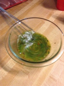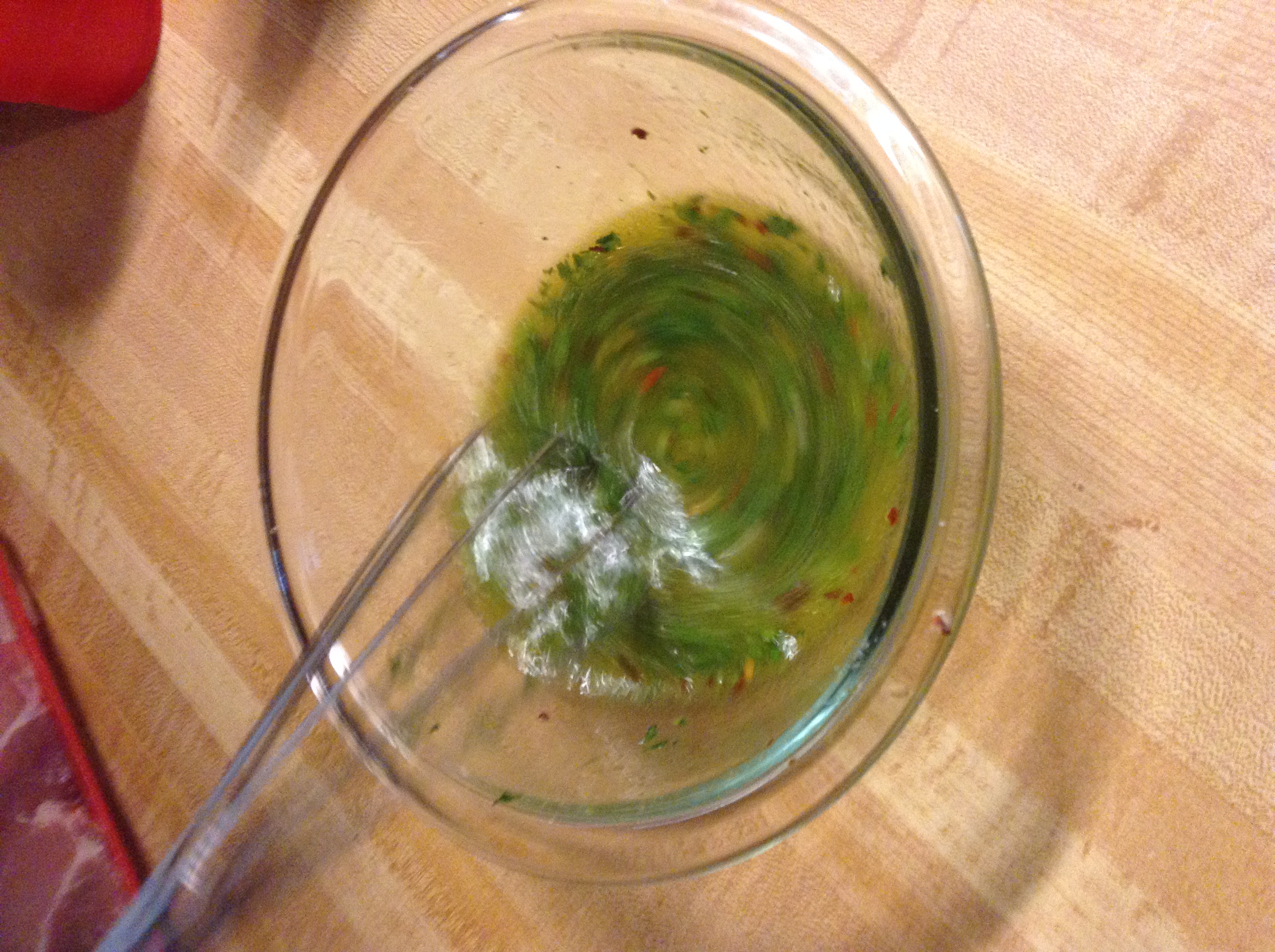 - Slowly whisk in the olive oil until completely combined. Set aside.