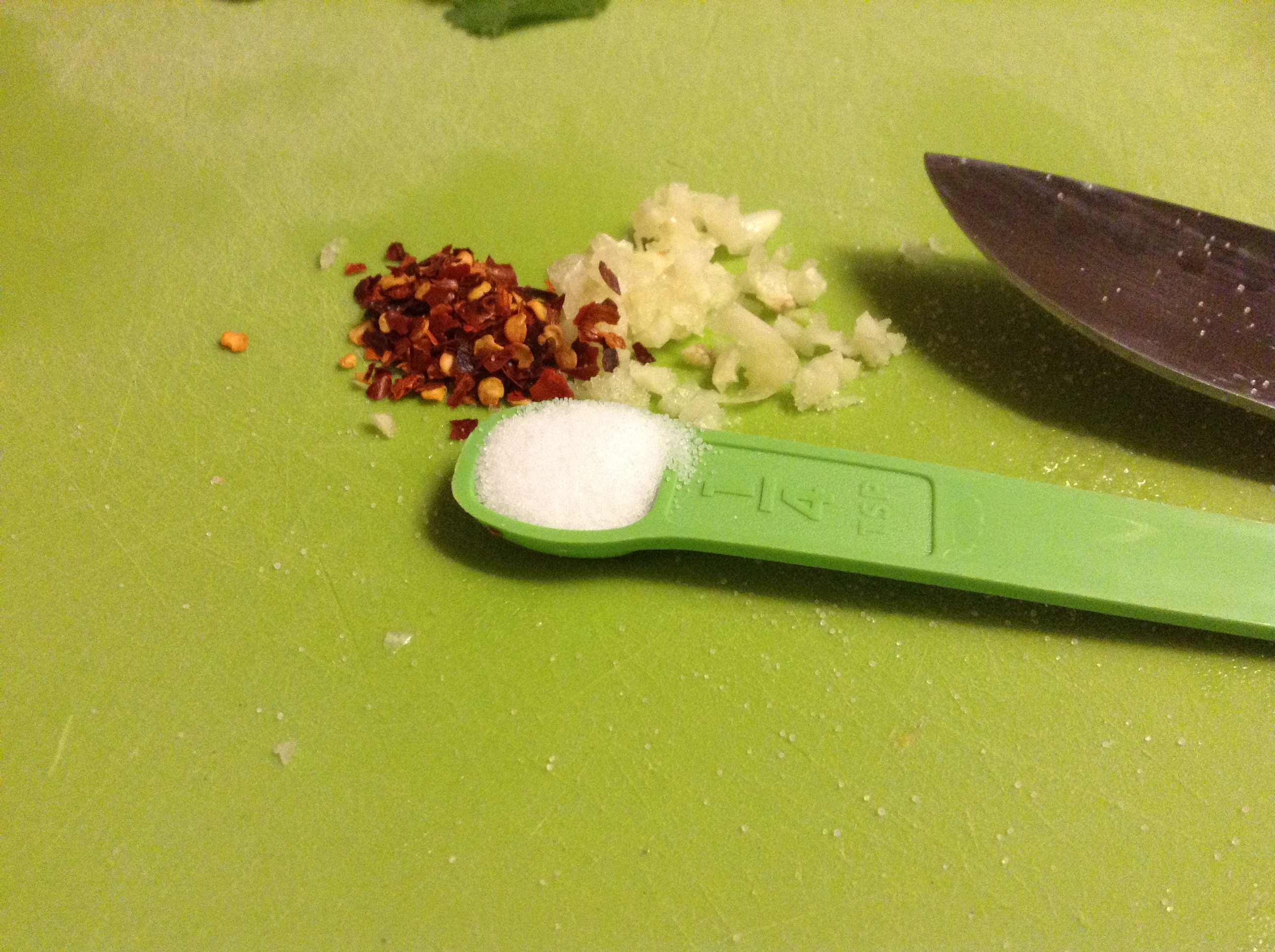 Add the lime juice to a bowl and whisk in the minced garlic, salt, and red pepper flakes.