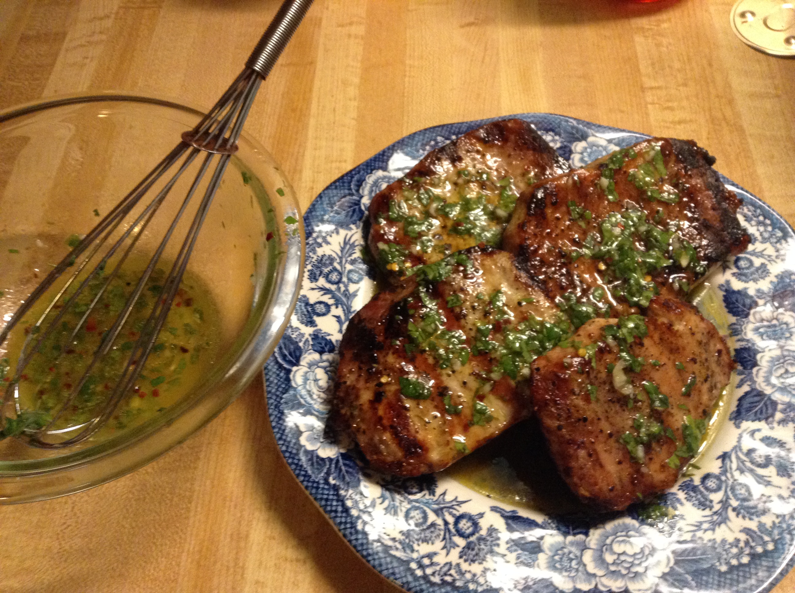 Serve the chops with the vinaigrette drizzled over the top. Reserve some extra vinaigrette if any of your eaters are into dipping. Enjoy!