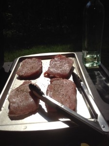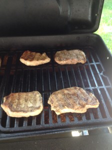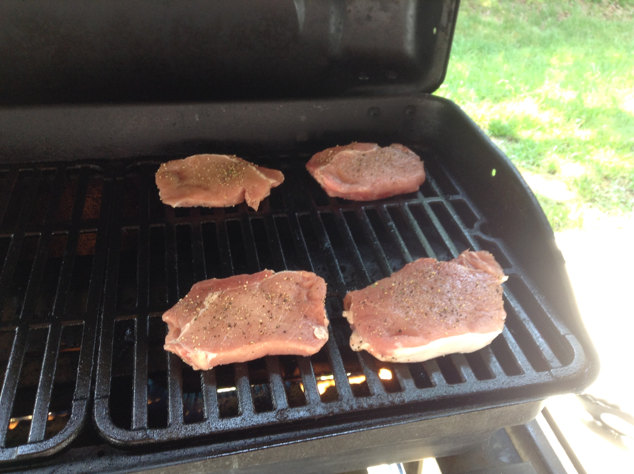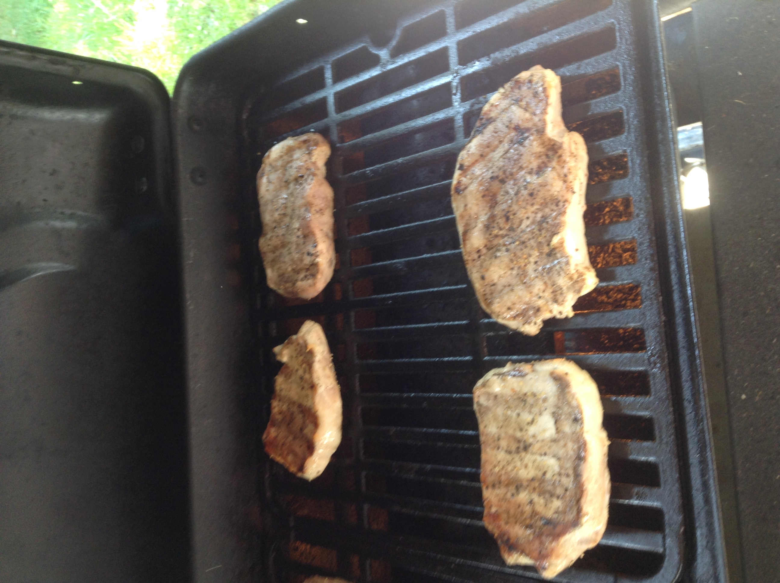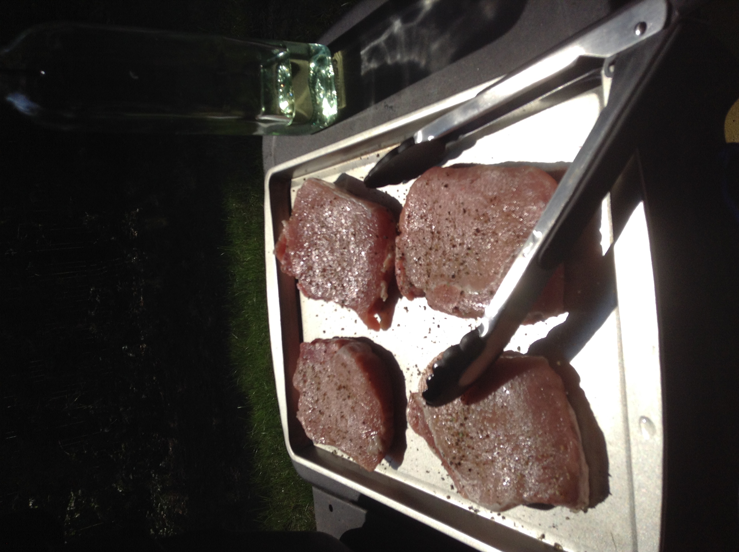 Stick your lovely seasoned chops on the grill, close the lid, and walk away. I find that a grill is like a kettle – a watched kettle never boils. However, an ignored grill almost always burns. So don’t go too far, but let the chops cook for 4-8 minutes depending on the thickness. I had medium, center cut chops so 5 minutes was sufficient.