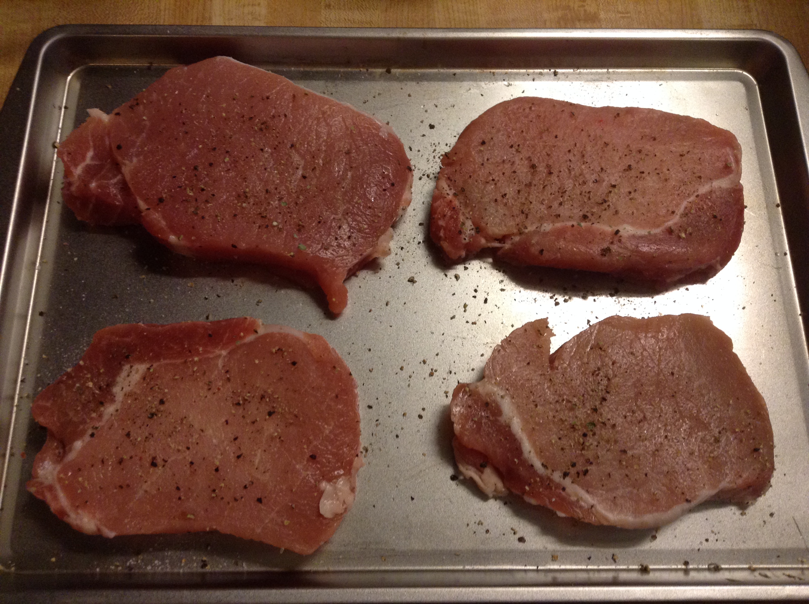 - Pat pork chops dry with a paper towel and season both sides with salt and pepper.